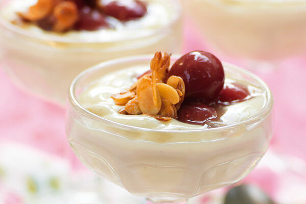 Die Masse mit zwei Esslffeln zu Nocken formen und auf die erfrischende Kaltschale setzen. Auch wenn es mit Kirschen aus dem Glas schneller geht sollte man das Dessert unbedingt mit frischen Skirschen ausprobieren die das Aroma des S.
