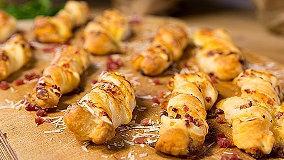 Bewertungen Zwiebel in kleine Wrfel schneiden und goldgelb anbraten. Bltterteigschnecken mit Schinken Salami Crme frache geriebenem Gouda Bltterteigschnecken Partyfood Fingerfood. Teigrnder umklappen so dass ein rechteckiger Strang entsteht.